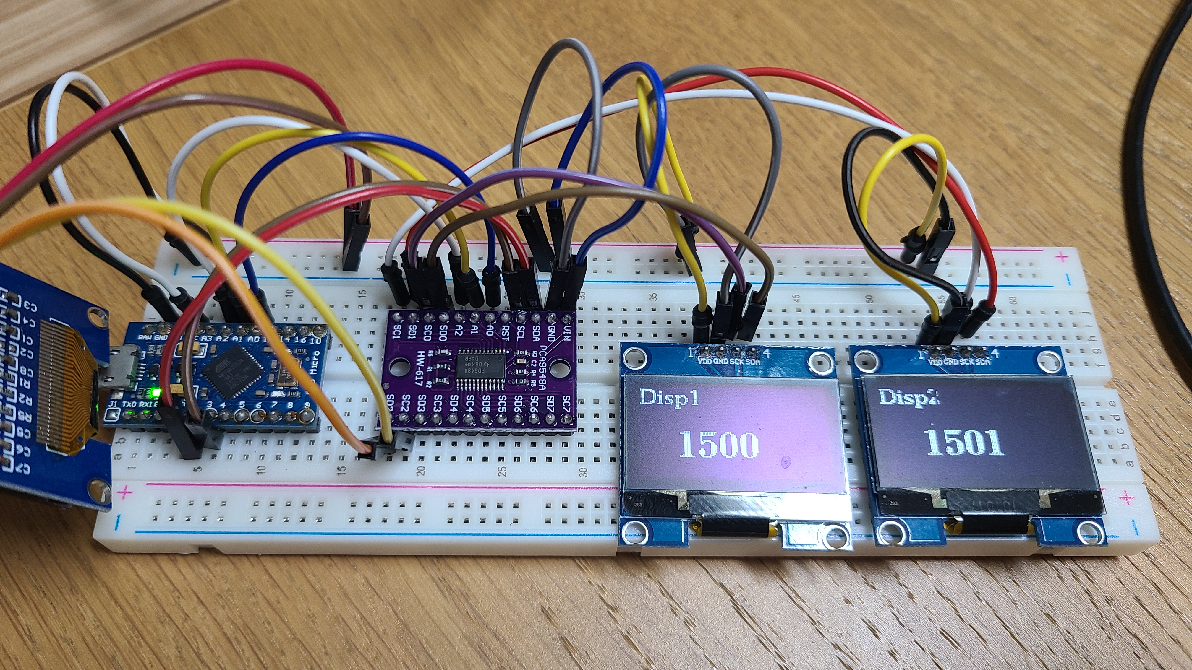 테스트를 위해 아두이노 micro pro버전에 멀티플렉서를 연결하여 멀티플렉서에는 oled 디스플레이 3개를 연결하였습니다.