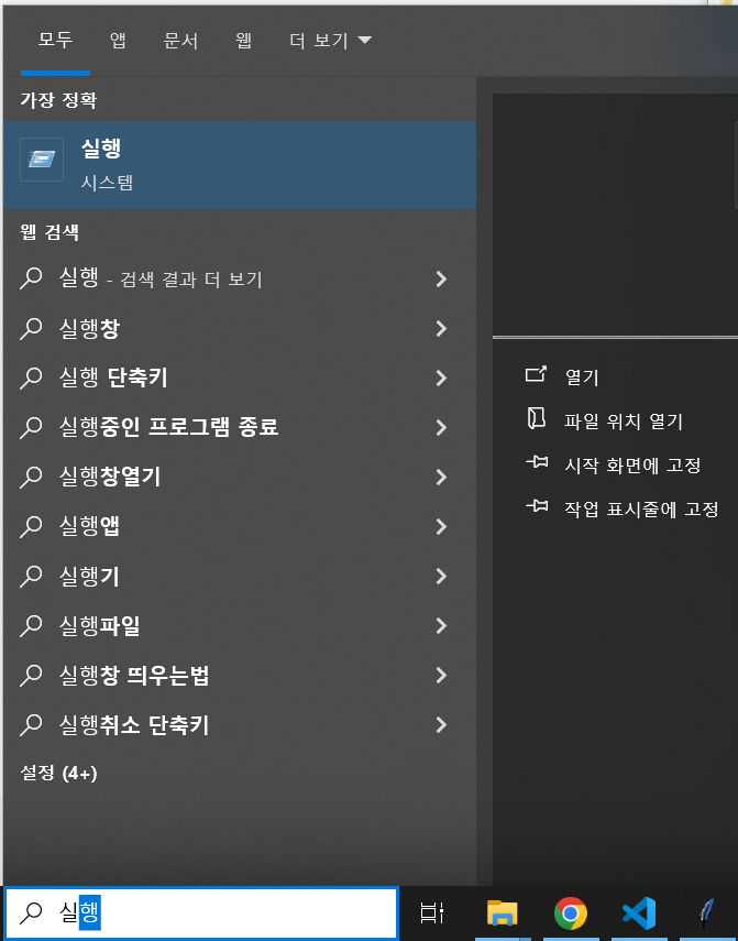 3. 윈도우 검색창에 '실행' 검색하여 실행창 열기